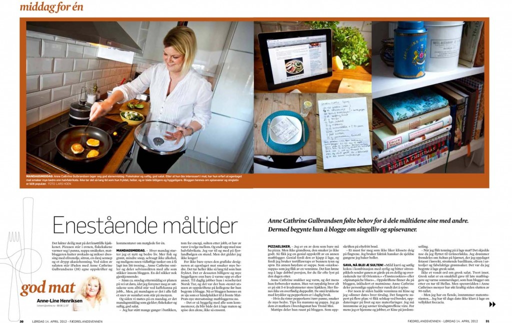 Jeg er ikke den som stikker nesa mi for langt fram i det offentlige rom, men det er jo alltid gøy å komme i avisa. Derfor sa jeg høflig «Ja, takk» da Anne-Line Henriksen (matspaltist i Fædrelandsvennen) spurte om å få komme på besøk på mitt lille kjøkken. I løpet av en hektisk ettermiddag lagde jeg 3 (!) middager, ble fotografert, og snakket altfor mye om meg selv og bloggen min. Middagene jeg lagde var Henriettes snaskesuppe, Mandagsmiddag og Juksepizza (og jeg må innrømme at jeg hadde tatt en «Ingrid Espelid» og juksa litt på førehand). Resultatet stod på trykk 14. april og artikkelen kan du lese her.