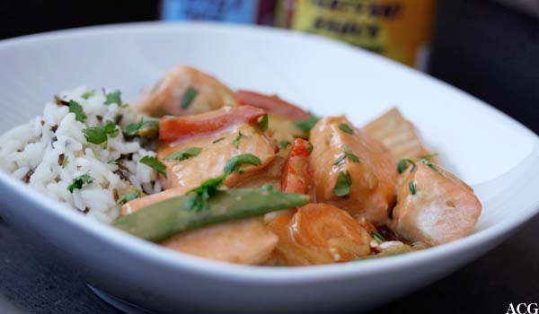 In a frying pan: heat a little oil over medium to strong heat and add the onion, garlic, chili and carrot slices. Stir for a couple of minutes. Add the bell pepper and sugar snaps, and the lime juice. Stir for a minute more. Add the teriyaki sauce and coconut milk to the pan and stir until blended. Turn down the heat and add the cubes of salmon. Leave to steam under a lid until the salmon is cocked through. Add salt to taste. Serve with some chopped coriander, sweet chili sauce and boiled rice.