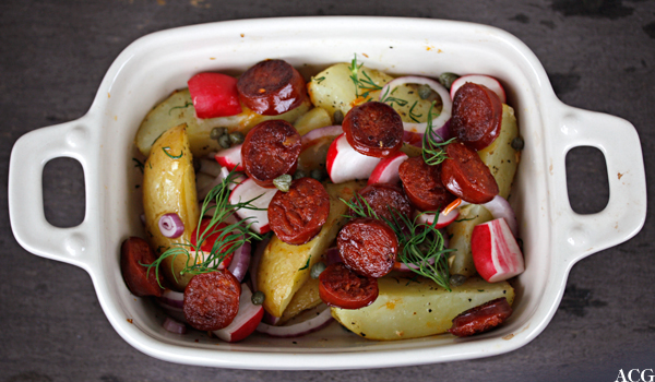 This recipe reminded me that capers goes really well with potatoes, and that the best chorizo available is in Spain (since it is a Spanish sausage this should be obvious ;-) ). This very tasty dish stands on its own, or can be used as powerful side dish.