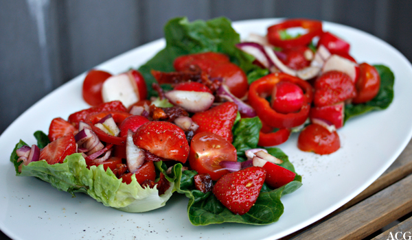 Fargekoordinert salat! Fint skal det være… Det er definitivt høysesong for salat hjemme hos meg. Som hovedrett, tilbehør, lunsj, og mellommåltid. For å få litt variasjon lot jeg designeren i meg overta matlagingen en dag. Dermed endte jeg opp med en rød salat, dandert på en seng av grønne blader. En spennende komplementær fargekombinasjon – som «tilfeldigvis» også smakte veldig godt.