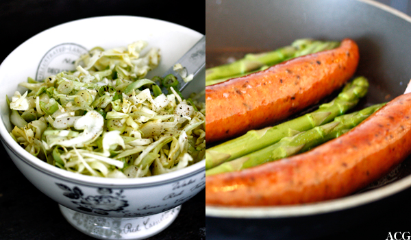 Har du grill, grilles pølsene og aspargesene etter beste evne. Uten grill gjøres følgende: Smelt smør i en stekepanne på middels sterk varme. Legg i pølsene og la de steke noen minutter før aspargestoppene legges i. Pølsene og aspargesen er ferdig når begge deler har fått gylden stekefarge og er gjennomvarme.