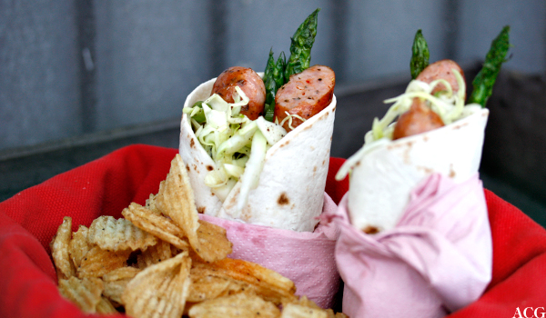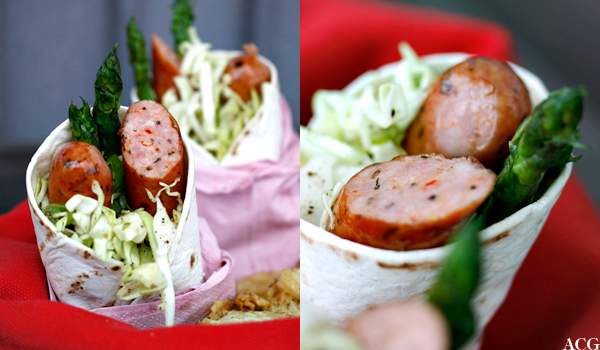 Del pølsene i 2 og legg 2 pølsebiter og 2 aspargestopper på hver tortillalefse. Fyll på med nykålsalat, brett sammen wrapsene og nyt. Gjerne med litt knasende Sørlandschips som tilbehør.