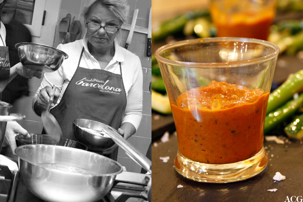 More ladies did the second dish: the starter romesco sauce with vegetables. Dried, mild chilies (nyores), toasted almonds and hazelnuts, fried bread, tomatoes and garlic made for a spicy dip for blanched and sautéed asparagus and courgettes. According to our chef the romesco sauce also goes well with fish, meat, shellfish and as a thickening agent in stews. As a dip: perfect!