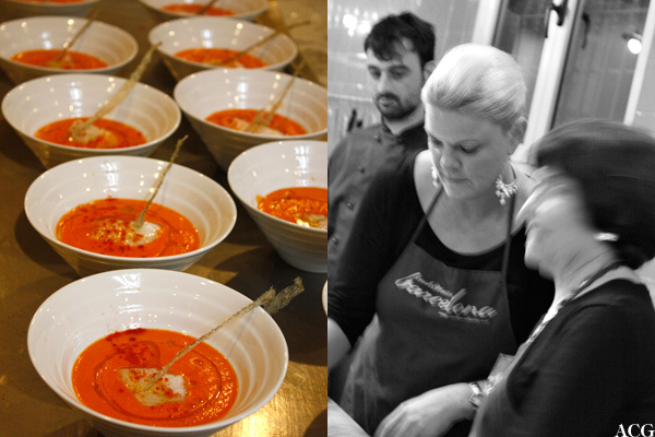 As I love soups, I volunteered to make the sopa de pimento rojo al aroma de azafrán tostado con bacalao. Got that? Red bell pepper soup with toasted saffron and cod. It involved baking of bell peppers, chopping of shallots, confiting of cod, baking of cod skins… The result: a smooth and mild soup with heavenly, flaked cod.