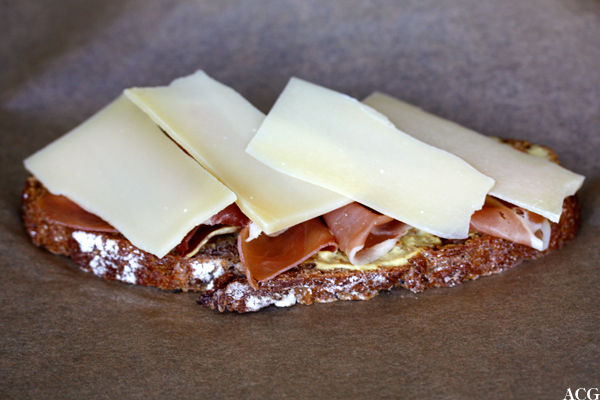 Sett ovnen på 180 grader med grillelementet på. Rist brødskiven på begge sider under grillemementet, eller i brødristeren. Smør hvitløksconfit og sennep på brødskiven og legg på skiver med serransoskinke. Har du ikke hvitløksconfit, del et fedd vanlig hvitløk på langs og gni snittflaten over brødskiven. Legg til slutt på tykke skiver med ost, og plasser smørbrødet på bakepapirkledd stekebrett. Sett brettet ganske høyt i ovnen og stek til osten er godt smeltet og bobler av glede.
