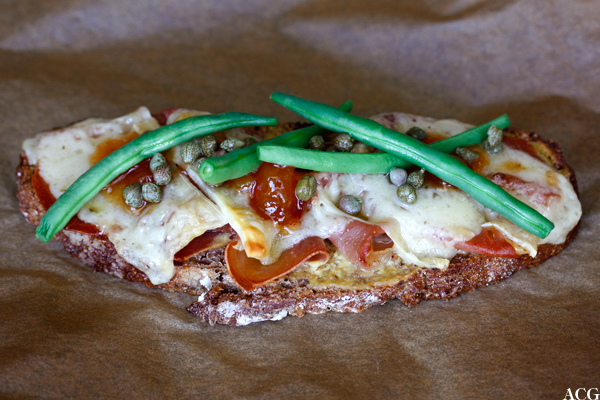 Topp det ferdig stekte ostesmørbrødet med aspargesbønner, kapers og søt mangochutney. Så er det bare å lene seg tilbake og kjenne hvordan verden gjenvinner balansen…