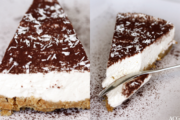 Whip the cream cheese soft, and then beat in the Baileys and icing sugar. Whip the double cream until stiff, and fold gently into the cream cheese mixture. Spoon the filling into the set base and smooth over. Cover the tin with a lid or cling film, and refrigerate until set (2-6 hours). Remove the rim from the finished cake, and decorate with a gentle dusting of cocoa powder and a little grated white chocolate.