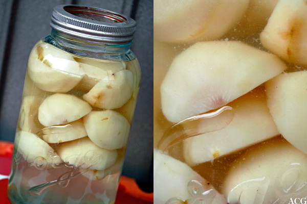 Bruk pærer som så vidt er modne – faste og syrlige. Skrell pærene. Del i to, og fjern stilk og kjernehus. Legg frukten i en saltvannsblanding (1 liter vann + 1 ts salt) for å forhindre misfarging mens sukkerlaken forberedes.