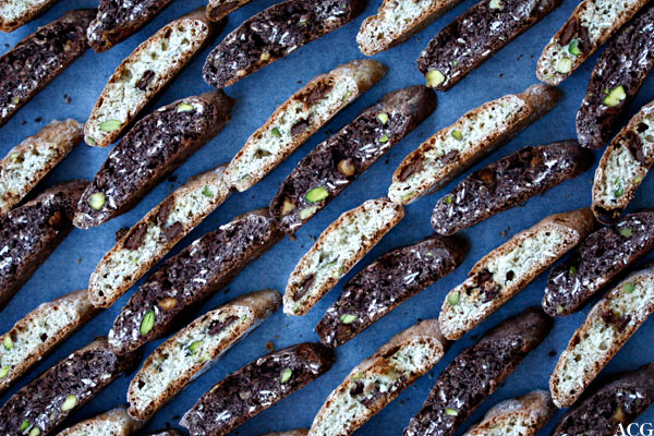 Del de to deigene i to emner hver. Trill hvert emne til en lang pølse som legges på bakepapirkledd stekebrett. Press pølsene litt ned med håndbaken. Ønsket høyde er ca 2 cm. Ønsket bredde er ca 4-5 cm. Stek midt i ovnen i ca 35 minutter til overflaten har fått en gylden farge. Bruk en skarp kniv og skjær ca 1 cm tykke skiver på skrå. Dette må gjøres med en gang de kommer ut av ovnen. La biscottiene avkjøles helt før de legges i kakebokser eller pakkes inn for å gi bort i vertinnegave, venninnegave, kollegagave osv…