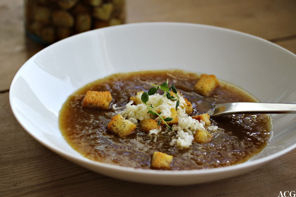 Skal du servere løksuppe til mange (som for eksempel en lørdag ettermiddag når suppekjøkkengjestene velter inn døra), kan gratinert løksuppe by på visse logistiske problemer. Hjemmelagde timiankrutonger og Gruyerechips (eller bare revet Gruyere) kan være løsningen. Krutongene gir en god krønsj, og Gruyere smaker jo godt uansett.