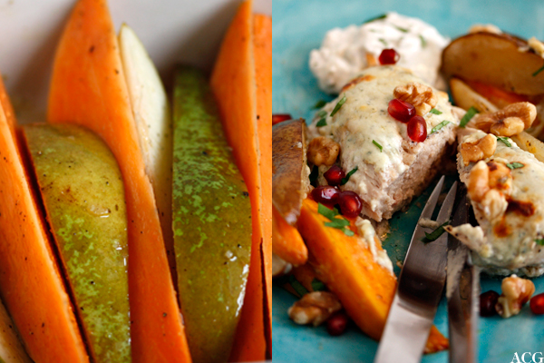 Kyllingfilet med ostekrem og ovnsbakt pære og søtpotet