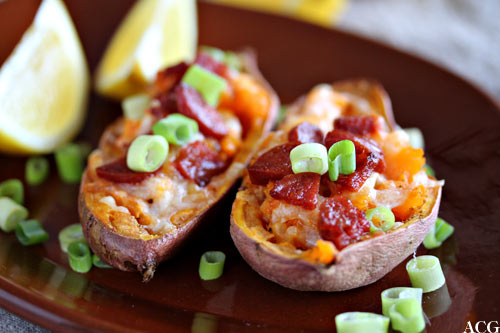 Når søtpoteten er mør hele veien gjennom, ta ut av ovnen og øk temperaturen til 230 grader. Bruk en t-skje til å grave ut innmaten. Vær forsiktig slik at ikke skallet blir skadet. Ha innmaten over i en bolle og rør inn revet ost, chorizobiter og litt finsnittet vårløk. Skvis over litt sitronsaft og rør om før blandingen legges tilbake i søtpotetskallene. Strø gjerne over litt ekstra ost på toppen før brettet settes inn igjen i ovnen, gjerne høyt oppe. Stek til du ser osten smelter og pølsa svetter. Server med mer vårløk, sitronbåter og kanskje en klatt rømme hvis du har…
