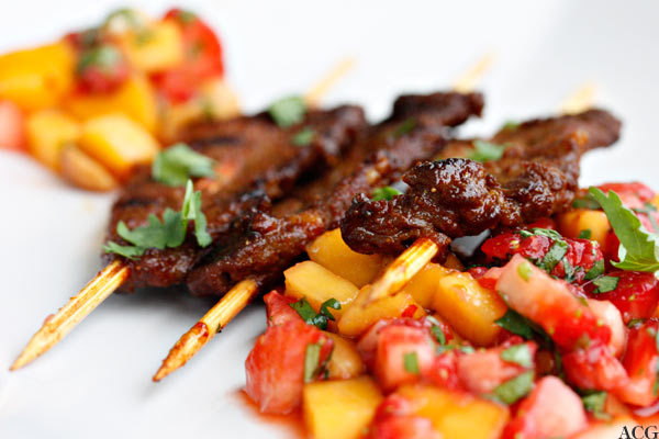 Satay er grillspyd fra det thailandske kjøkken. Det er tradisjonelt sett gatemat siden kjøttstykkene er tynne og raske å grille. Har du ikke tid til å la kjøttet marinere er det bare å pensle kjøttet mens det ligger på grillen. Jeg liker godt å servere de smaksrike spydene med frisk og søt jordbærsalsa. Sommerlig og utrolig godt. Oppskriften finner du her. Og husk: marinaden funker utmerket godt til kylling, og jordbærsalsaen er himmelsk god til grillet laks.