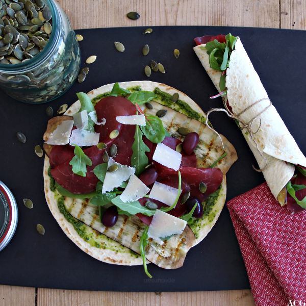 Smør en spiseskje pesto utover på hver tortilla. Legg på aubergineskiver, salatblader, skinke og oliven. Topp med noen tynne skiver parmesanost og dryss til slutt over gresskarkjerner. Rull sammen og nyt!