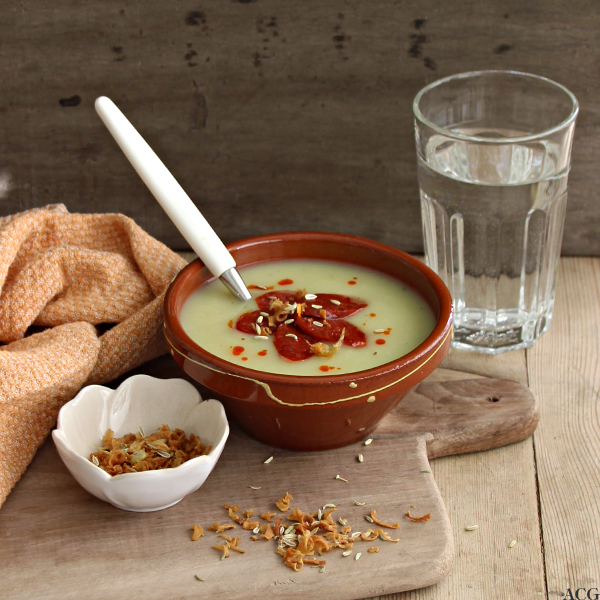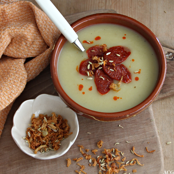Potetsuppe er svært populært, og det er ikke uten grunn. Vichyssoise (potet- pg purresuppe) er jo en klassiker – ingrediensene er lett tilgjengelige og den er enkel å lage. Men det er ikke til å stikke under en stol at potetsuppe kan være svært mild, og jeg merker at jeg ikke alltid er så god på «mild». Noen dager må jeg bare ha litt mer slagkraftig smak. Derfor liker jeg å «piffe» den opp litt. Pynte litt på brura, som det heter. Her har jeg droppet purren til fordel for den litt frekkere fennikelen, toppet med ristede fennikelfrø (for å få fram enda mer av den gode anissmaken), chorizopølse og sprøstekt løk fra pose! Crazy I know, men det funker som heia!