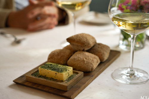 Da apetitten var behørlig pirret og smaksløkene vekket, kom nystekte rundstykker på bordet sammen med smør med forskjellige typer tørket tang, før kveldens første rett ble servert: rykende varm, kremet grønn aspargessuppe, med luftige salt krutonger og rød oxalis. Til denne fikk vi en rund og smørrik chardonnay (Bourgogne Chardonnay Domaine Fabien Coche 2013).