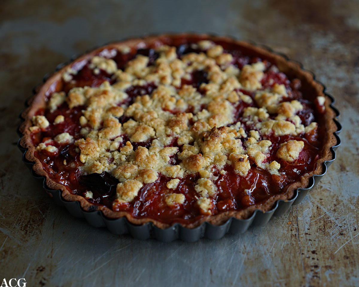 Fordel de varme plommene med snittflaten ned i det forstekte paiskallet. Pass på å få med all den gode sausen i panna. Plommene skal ligge tett, men ikke overlappe. Ta ut den kalde smuldredeigen og smuldre et lag over plommene. Fordel noen små smørklatter på smuldredeigen om ønskelig og sett plommepaien i ovnen. Steke på 200 grader i 25-30 minutter til paien er blitt gylden og sprø-ish på toppen. Avkjøl på rist.