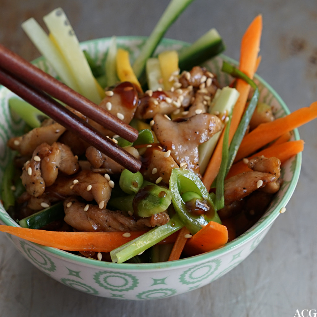 Server hoisinstekt kylling med strimlet gulrot, agurk, mango, vårløk og sukkererter – enten i en bolle sammen med ris, eller pakket i en wrap. Topp med stekte sesamfrø og fersk koriander (selv om jeg ikke hadde det da jeg tok bildene så lover jeg det er himla godt). Og så er det bare å nyyyyde!